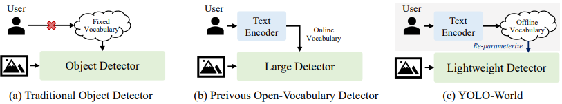 Authors present YOLO-World, real-time open-vocabulary detector to imporve efficiency and capability. So They propose offline vocabulary in inference, utilize rep VL-PAN to interact text, image features, utilize YOLO to extract feature
