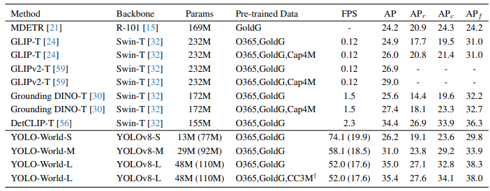 They demonstrate the effectiveness of the proposed YOLO-World by pre-training it on large-scale datasets and evaluating YOLO-World in a zero-shot manner on both LVIS benchmark and coco benchmark. And also evalute the fine-tuning performance of YOLO-World on COCO, LVIS for object detection