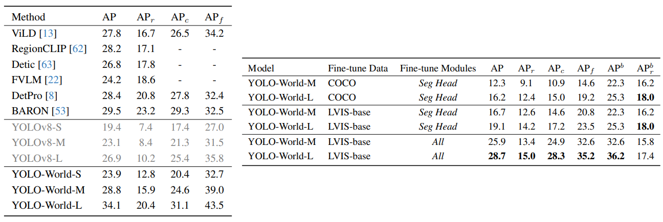 They evalute the fine-tuning performance of YOLO-YOLO-World on the standard LVIS dataset. Firstly, compared to the oracle YOLOv8s trained on the full LVIS datasets, YOLO-World achieves significant improvements, especially for larger models. The improvements can demonstrate the effectiveness of the proposed pre-training strategy for large-vocabulary detection, outperforming previous sota two-stage methods.