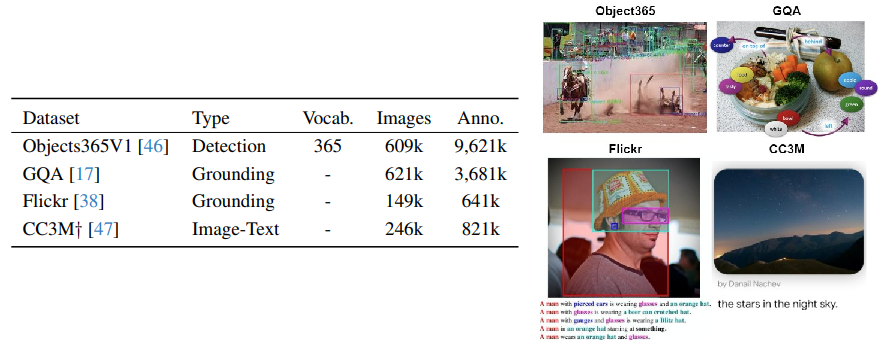 For pre-training YOLO-World, they mainly adopt detection or grounding datasets including Object 365, GQA, Flickr30k. In addition they also extend the pre-training data with image-text pairs $i.e.$, CC3M.