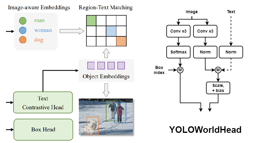 YOLO-World consists of a YOLO detector, Text Encoder, Re-parameterizable Vision-Language Path Aggregation Network. Given the input text, the text encoder in YOLO-World encodes the text in to text embeddings, The image encoder in the YOLO detector extracts the multi-scale features from the input image. Then YOLO-model leverage the RepVL-PAN to enhance both txt and image representation by exploiting the cross-modality fusion between image features and text embeddings.