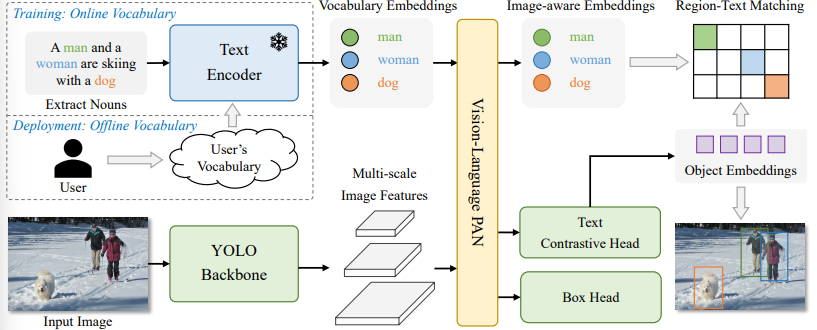 They propose the Text-guided CSP Layer (T-CSPLayer) and Image-Pooling Attention (I-Pooling Attention) to enhance the interaction between image features and text features, which can improve the visual-semantic representation for open-vocabulary capability. During inference, the offline vocabulary embeddings can be re-parameterized into weights of convolutional or linear layers for deployment.